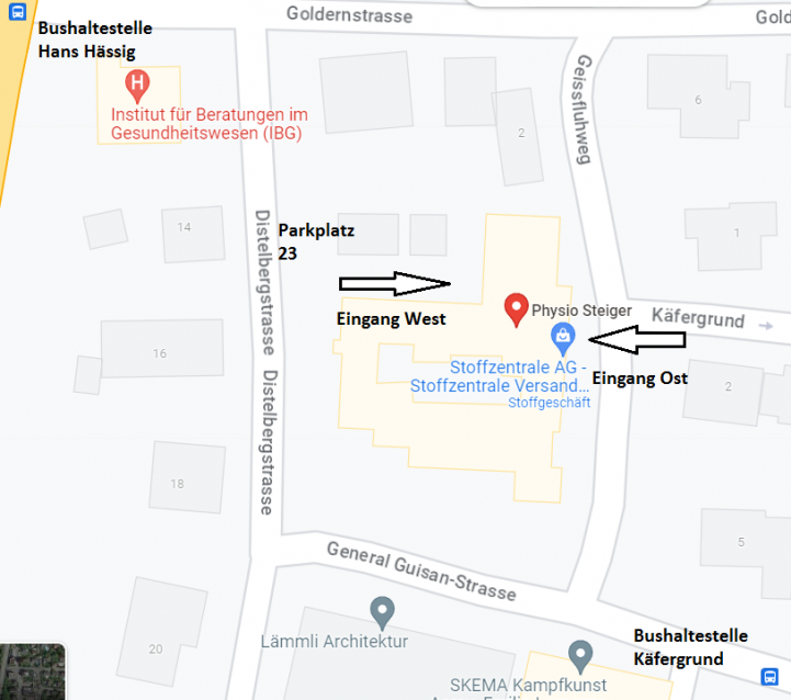 An der Westseite des Gebäudes (Distelbergstrasse) können Sie den Parkplatz Nummer 23 (Physio Steiger) nutzen.